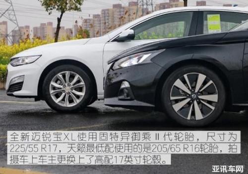輪胎方面,全新邁銳寶 xl 與天籟都是使用靜音舒適型輪胎。不過天籟在低配以及次低配車型上使用的是 16 英寸輪轂,樣式相比 17 英寸的輪轂普通很多,而全新邁銳寶 xl 僅在