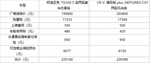 想要選購一輛落地價(jià)格在25萬元以內(nèi)、空間大、動力強(qiáng)、配置豐富的合資品牌SUV,目標(biāo)車型上汽斯柯達(dá)柯迪亞克、東風(fēng)本田CRV。我們此次著重對比的就是柯迪亞克 TSI330 5座兩驅(qū)豪華優(yōu)享版和CRV 耀目版plus 240TURBO CVT兩驅(qū)風(fēng)尚版,兩車的廠商指導(dǎo)價(jià)分別為19.99萬元和20.38萬元。