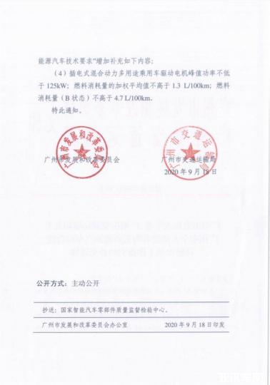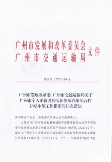 9月18日,廣州市發(fā)改委、廣州市交通運(yùn)輸局關(guān)于《廣州市個人消費(fèi)者購買新能源汽車綜合補(bǔ)貼申領(lǐng)工作指引通知》中“三、車輛要求”有關(guān)“3.新能源汽車技術(shù)要求”增加補(bǔ)充內(nèi)容:(4)插電式混合動力多用途乘用車驅(qū)動電機(jī)峰值功率不低于125kW;燃料消耗量的加權(quán)平均值不高于1.3L/100km;燃料消耗量(B狀態(tài))不高于4.7L/100km。凡是2020年3月1日至2020年12月31日期間在廣州市辦理注冊登記(登記時間以《機(jī)動車登記證書》為準(zhǔn)》)的個人消費(fèi)者,均可獲得每年1萬元綜合性補(bǔ)貼。