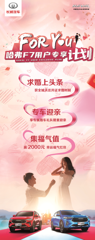 由于2021款哈弗F7/F7x的用戶(hù)大部分都是年輕人,其中不乏準(zhǔn)備結(jié)婚的用戶(hù),對(duì)此2021款哈弗F7/F7x分分鐘幫你安排!針對(duì)新婚夫婦用戶(hù),2021款哈弗F7/F7x推出 “求婚上頭條”、“婚禮專(zhuān)享迎親車(chē)隊(duì)”以及“新婚福氣紅包”三大福利。
