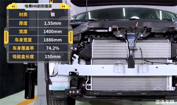 前防撞梁。第三代哈弗H6的前防撞梁,梁體后為1.55mm,吸能盒長達(dá)150mm,梁體寬也是高達(dá)1400mm,此外,比較好評的細(xì)節(jié)是非常貼心地將中冷器放置于高位,并在下方多加了一條防撞梁,維修經(jīng)濟性很高。