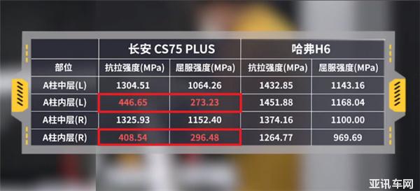 A柱強度。(這里引入的是《懂車大爆炸》的測評內(nèi)容)第三代哈弗H6,全系標(biāo)配6安全氣囊,以及71.61%的高強度鋼車身。拆車后,如圖所示數(shù)據(jù),基于“外強內(nèi)軟、左高右低”的造車標(biāo)準(zhǔn),第三代哈弗H6的A柱中層、內(nèi)層均有著不錯的拉伸與屈服強度,且關(guān)鍵部位像A柱外層、B柱、機艙縱梁、門框梁等,最高使用近2000Mpa強度熱成型鋼。而C柱、D柱這些無需高強度剛的部位,第三代哈弗H6也是保持了“一視同仁”,沒有特別薄弱的部位。整體質(zhì)量品控、安全系數(shù)等,基本與宣傳相符。