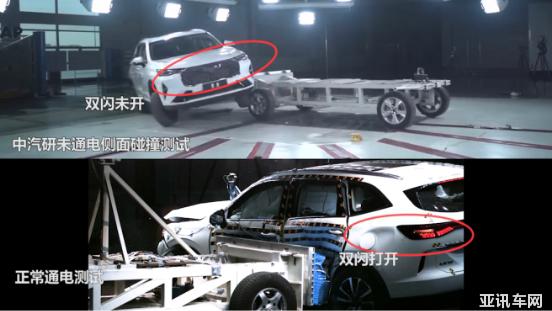 1、這款車搭載了前排側(cè)氣囊以及前后排頭部氣囊(側(cè)氣簾)。據(jù)了解,此次測試臺車重1.4噸,按照特定的角度以50km/h的速度完成側(cè)面碰撞,但是,日行燈未亮,撞擊后雙閃燈未亮,那么車輛似乎確實處于未通電狀態(tài),在這個狀態(tài)下,傳感器未工作,氣囊就無法彈開。