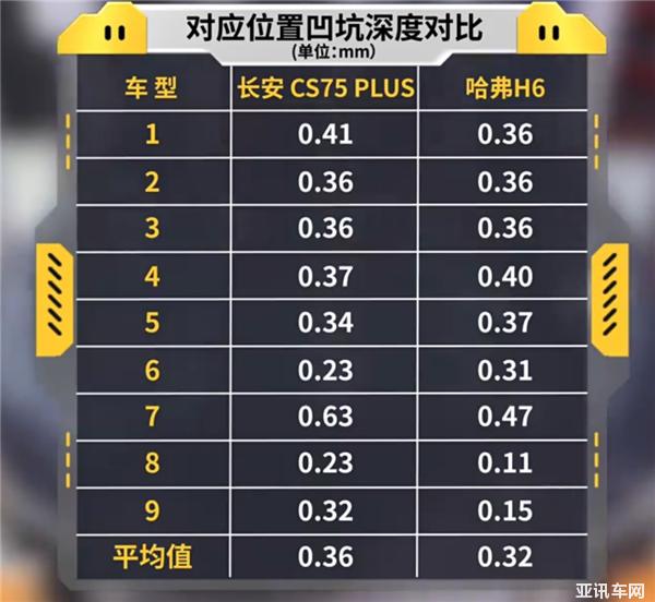 在抗劃與抗砸性上,兩車也同樣出現了差異,針對防冰雹能力,第二代哈弗H6再次小勝一籌,以0.32mm對0.36mm的差距證明了其車身強度,這意味著在面對重物接觸時可以減少外力對車體的傷害以及對于車體美觀的影響。因此在客觀的車體制作工藝中,第二代哈弗H6領先于長安CS75 PLUS獲得勝利。