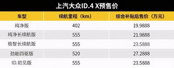 近日,上汽大眾全新純電動SUVID4X正式開始預售,由女神劉亦菲作為代言人。自從去年廣州車展亮相后,不少消費者都關(guān)注著ID4X的一舉一動。無論是顛覆以往的前衛(wèi)設計,還是最大555KM的續(xù)航能力,都讓大眾ID4X成為消費者關(guān)注的焦點。如今,ID4X終于正式公布預售價,綜合補貼后起售還不到20萬,真是有實力又有性價比的一款純電動車。