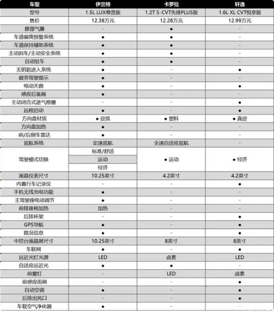 作為科技發(fā)燒友的小李,對汽車的智能網(wǎng)聯(lián)配置也是相當重視,特別是在選擇人生的第一臺車上顯得格外慎重,他也重點根據(jù)自己12萬預(yù)算列出了自己能買到的配置:第七代伊蘭特1.5L LUX尊貴版、卡羅拉1.2T S-CVT先鋒PLUS版、以及軒逸1.6L XL CVT悅享版,可以發(fā)現(xiàn)卡羅拉和軒逸的配置沒有給他帶來太多驚喜,只有第七代伊蘭特才真正做到了讓他眼前一亮。