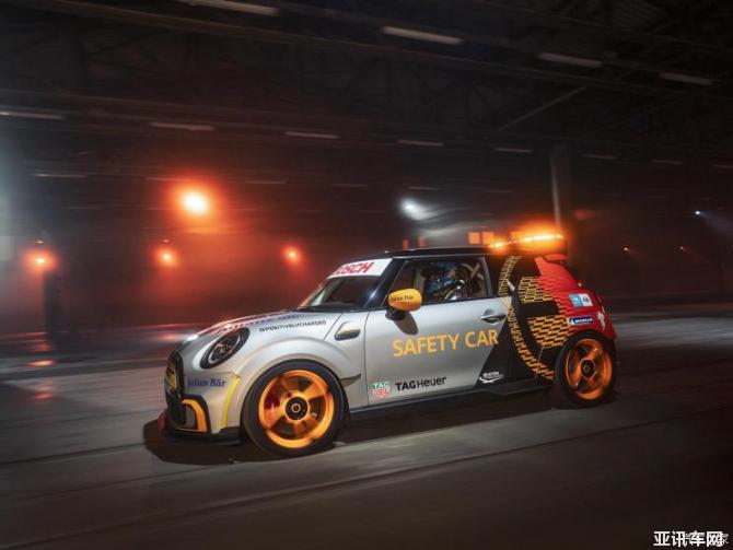 新車基于MINI COOPER SE為賽道量身打造,是MINI Design、寶馬賽車、國際汽聯(lián)和FE共同合作的產(chǎn)物,代表了迄今為止對全電動MINI最具活力的詮釋。整車以銀色與橙色作為主基調(diào),車頭依舊充滿了MINI與JCW極具辨識度的元素,圓形頭燈與大嘴狀散熱格柵搭配亮橙色的內(nèi)扣型前唇增強了前端的運動視覺效果。安全車獨有的白色爆閃燈被和諧地集成到發(fā)動機蓋前端。獨特的MINI發(fā)動機罩條紋從車頂一直延伸至車尾。