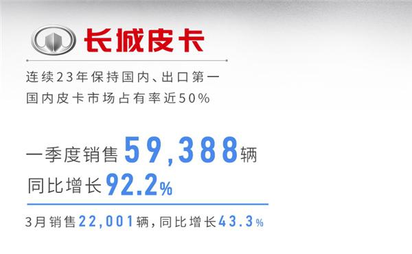 三月份的銷量排行榜單,已經(jīng)洋洋灑灑遍布各大汽車網(wǎng)站。在皮卡的戰(zhàn)場(chǎng),長(zhǎng)城汽車再一次取得勝利——三月份總銷量22,001輛,同比大增43%,市占率近50%。也就是說(shuō),如果全中國(guó)每天賣出兩輛皮卡,就會(huì)有一臺(tái)是長(zhǎng)城皮卡。