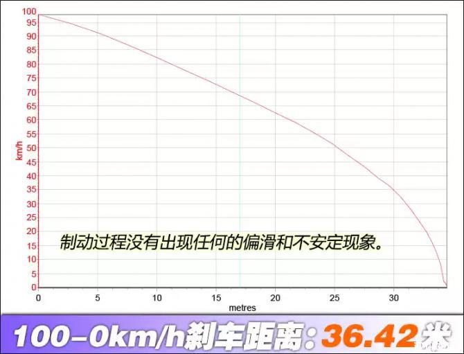 在測試剎車的時(shí)候,一腳踩下去的瞬間,會發(fā)現(xiàn)在極限剎車的工況下,剎車表現(xiàn)不會給人非?!斑^敏”的剎車力度,這對城市駕駛的舒適性可能會有正面幫助(剎車不會點(diǎn)頭)。雖然說我個人覺得第一腳的腳感不是很銳利的類型,但是我們還是測得了36.42m的剎停距離,而且經(jīng)過多此測試,剎車的狀況也在合理的范圍內(nèi)。