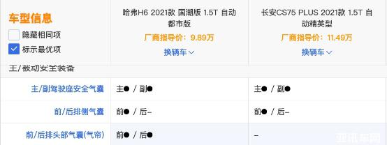 在性價(jià)比上,我們以對(duì)比來看。例如自動(dòng)擋入門版車型,哈弗H6國潮版 1.5T自動(dòng)都市版售價(jià)9.89萬,長安CS75 PLUS自動(dòng)精英型為11.49萬元(長安CS75 PLUS還有手動(dòng)版可選,這里不推薦)。配置上,哈弗H6潮流版配備了6氣囊和7大主動(dòng)安全防護(hù)系統(tǒng),而長安CS75 PLUS還是4氣囊,沒有定速巡航、方向盤換擋、負(fù)離子空氣發(fā)生器。