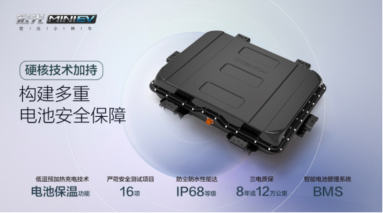 對新能源電池來說,非常重要的電池安全上五菱宏光MINIEV也做的不錯。宏光MINI EV搭載低溫預加熱技術和電池保溫功能,并歷經(jīng)16項嚴苛安全測試項目,防塵防水達到IP68等級,對冬季續(xù)航打折、雨雪惡劣天氣等問題都可以做到從容應對的同時,充分保障充電及用車安全。此外,宏光MINIEV還配備BMS 智能電池管理系統(tǒng),通過手機APP能夠全天候嚴密監(jiān)控電池工作狀況,為用戶提供全方位的高維安全防護。
