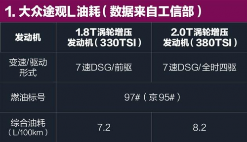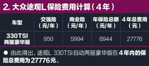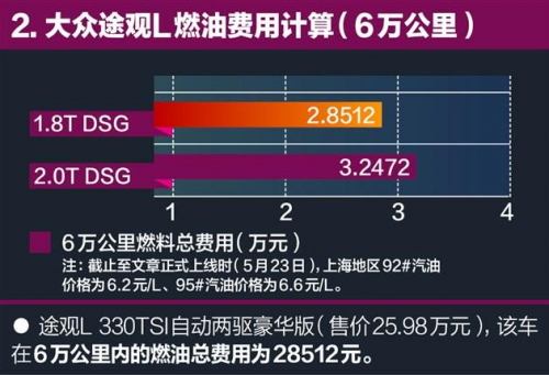 在保養(yǎng)價(jià)格上,途觀L 1.8T(330TSI)車型小保養(yǎng)僅需636元,低于漢蘭達(dá)(752元)和銳界(943元),在中型SUV陣營里顯得頗具性價(jià)比優(yōu)勢。另外值得肯定的就是途觀L全系的油耗水平,1.8T(330TSI)車型百公里綜合油耗僅為7.2L、2.0T(380TSI)車型為8.2L,同樣比漢蘭達(dá)和銳界都低了不少。在60000公里的行駛過程中,燃油費(fèi)用將占據(jù)用車總成本中的較大比重,因此越"省油"的車就勢必會帶來更低的后期用車成本。