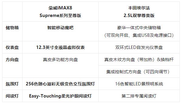 埃爾法則搭載豪華一體式中央儲物箱、雙環(huán)式LED自發(fā)光儀表盤、真皮木紋方向盤&換檔桿或集成控制式方向盤、16色智能LED景照明系統(tǒng)、第二排專屬閱讀燈等配置,還擁有后排豪華地毯及第二排專屬豪華迎賓毯,內(nèi)飾豪華感超強(qiáng)。整體來看,榮威iMAX8內(nèi)飾科技感比埃爾法突出,讓用戶的出行生活更舒心。