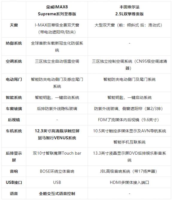 除了在碰撞安全方面有著行業(yè)領(lǐng)先的實(shí)力,榮威iMAX8的內(nèi)飾、座椅、智能化實(shí)力也統(tǒng)統(tǒng)在線,面對售價超過它近三倍的埃爾法絲毫不虛。接下來,我們就拿售價為25.38萬元的榮威iMAX8 Supreme系列至尊版(以下簡稱“榮威iMAX8”)與售價為89萬元的豐田埃爾法 2.5L 雙擎尊貴版(以下簡稱“埃爾法”)來進(jìn)行詳細(xì)的對比,看看這款20萬級國產(chǎn)MPV是否真有叫板“陸地頭等艙”的底氣。