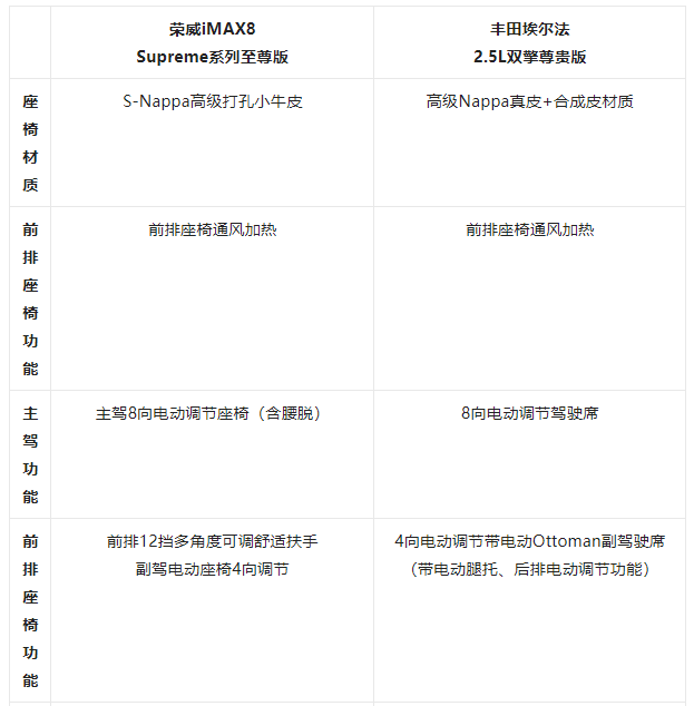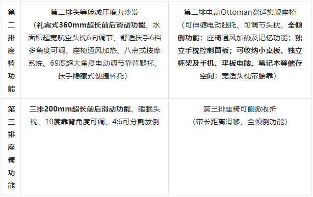 埃爾法的座椅為高級Nappa真皮+合成皮材質(zhì),第二排電動Ottoman寬適旗艦座椅帶可伸縮電動腿托、可調(diào)節(jié)頭枕、全傾倒、座椅通風(fēng)、加熱及記憶,以及獨(dú)立手枕控制面板、可收納小桌板、獨(dú)立杯架及手機(jī)、平板電腦、筆記本等儲存空間等功能,為用戶提供豪華舒適體驗(yàn),但相比榮威iMAX8少了腰部調(diào)節(jié)、按摩功能。其第三排座椅帶長距離滑移、全傾倒功能,滿足不同用戶的用車需求。