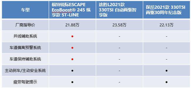 探岳的安全配置比途勝L強(qiáng)一些,但卻依然讓人無法用豐富來形容。探岳的價(jià)格比福特銳際高一些,但在安全配置上同樣也比不上福特銳際,像車道偏離預(yù)警、車道保持輔助、倒車車側(cè)預(yù)警等實(shí)用配置也處于缺失狀態(tài),著實(shí)不太給力。