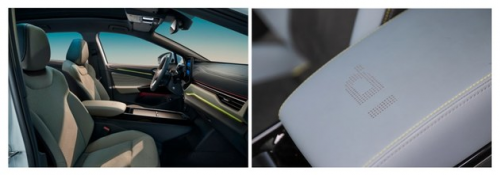 至于兩車內(nèi)飾的區(qū)別首先在于車內(nèi)配色搭配,ID.4 X相比ID.4 CROZZ無疑要更加充滿年輕活力而且擁有三種內(nèi)飾顏色搭配。另外ID.4 X在內(nèi)飾上使用了皮革包裹和縫線裝飾,質(zhì)感方面要比ID.4 CROZZ更好。而且兩車空調(diào)出風(fēng)口的樣式也不盡相同,ID.4 X出風(fēng)口飾條延伸至中控臺,豐富了層次感。至于在細(xì)節(jié)方面,ID.4 X的中央扶手上還有ID. 打孔字樣。座椅采用了奔馳 AMG-GT 車型同款的DINAMICA超細(xì)纖維麂皮絨面材質(zhì),舒適性更好的同時、耐用性更佳。