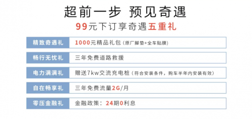 同時,用戶可以通過官方公布的搶訂通道參與99元搶訂活動,提前享受奇遇新車下訂五重禮政策,包含分期24期免息、三年免費(fèi)道路救援、三年免費(fèi)流量2G/月、1000元精品禮包(原廠腳墊+全車貼膜)、7kW交流充電樁(購車半年內(nèi)安裝有效)。