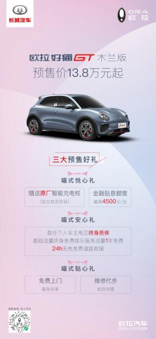 預(yù)售期間,通過搜索進(jìn)入微信小程序“歐拉ORA”或者微信掃描下方小程序碼即可下訂,暢享三大預(yù)售權(quán)益,提前選裝定制更多精彩。