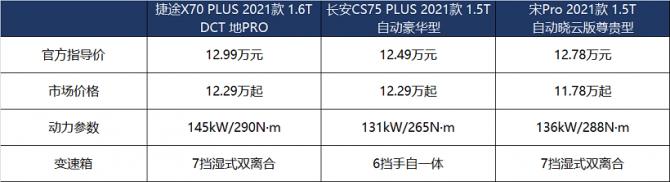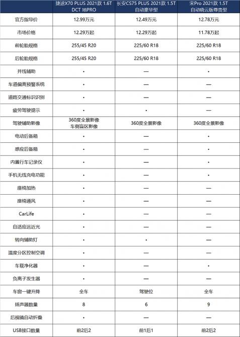 為了讓大家更清晰地在配置方面做出抉擇,筆者選擇了三車價格相近,且都為各自主銷的車型進行對比,分別為:捷途X70 PLUS 1.6T DCT地PRO、長安CS75 PLUS 1.5T自動豪華型和宋Pro 1.5T自動曉云版尊貴型。