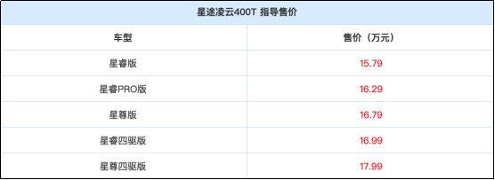 雖然動(dòng)力“過(guò)?!?,但星途凌云400T絕不是一臺(tái)冷冰冰的性能機(jī)器,諸多智能、豪華配置的加入,讓其貼合年輕人的生活喜好,而5個(gè)版本、15.79-17.99萬(wàn)元的指導(dǎo)售價(jià)區(qū)間詮釋了品價(jià)比,更極大程度讓其具備了領(lǐng)先同級(jí)車(chē)型的差異化優(yōu)勢(shì)。
