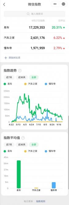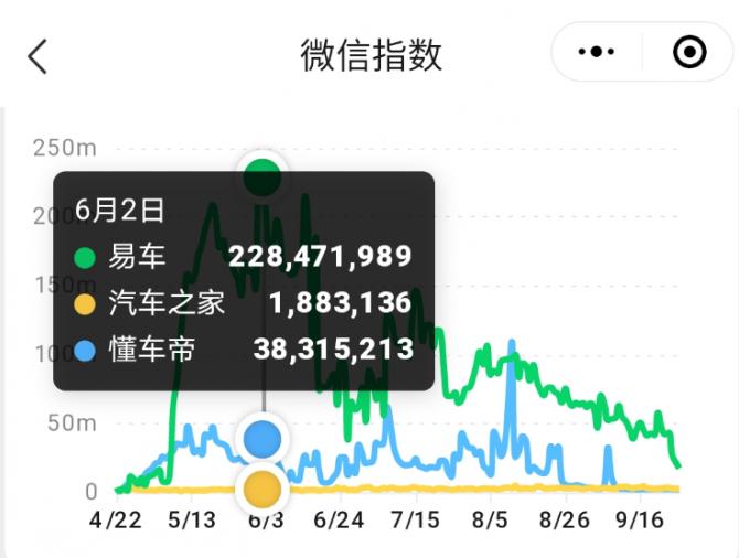 不唯如此,易車視頻號(hào)也為易車微信指數(shù)相對(duì)同行的碾壓式表現(xiàn)提供了有力助攻。在最近的5個(gè)月中,“易車”品牌詞日指數(shù)穩(wěn)居千萬級(jí)別,并有超2個(gè)月時(shí)間指數(shù)過億,絕大多數(shù)時(shí)間超過5000萬,遠(yuǎn)超主要競(jìng)爭(zhēng)對(duì)手的百萬量級(jí)。