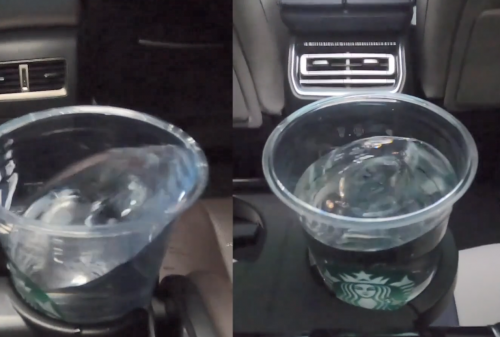 如上圖所示,左側(cè)奧迪Q5L在轉(zhuǎn)彎時(shí)車(chē)對(duì)外側(cè)輪胎壓制較多,整個(gè)車(chē)身明顯傾斜,不過(guò)由于整體懸架偏運(yùn)動(dòng)風(fēng)格,因此在車(chē)內(nèi)駕駛雖然有傾斜感,車(chē)內(nèi)測(cè)試用水杯略有外溢,但整體而言,路感清晰,能夠有效應(yīng)對(duì)復(fù)雜路況;右側(cè)為WEY摩卡,繞樁轉(zhuǎn)彎表現(xiàn)更加穩(wěn)定,駕駛時(shí)能夠感覺(jué)到外側(cè)輪胎明顯有支撐,以保證整車(chē)過(guò)彎姿態(tài)優(yōu)雅,且車(chē)內(nèi)測(cè)試用水杯始終未有外溢,可見(jiàn)電控主動(dòng)懸架的出眾穩(wěn)定性、舒適度。