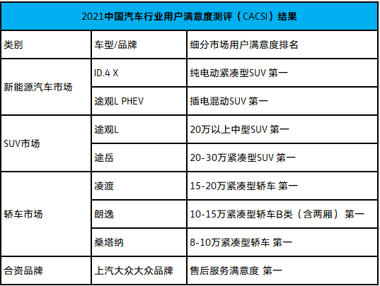 根據(jù)中國質(zhì)量協(xié)會用戶委員會10月12日公布的測評結(jié)果,上汽大眾大眾品牌各細分市場收獲頗豐,ID.4 X、途觀L PHEV、途觀L、途岳、朗逸、凌渡、桑塔納均榮登用戶滿意度榜首,售后服務(wù)亦取得合資品牌第一。