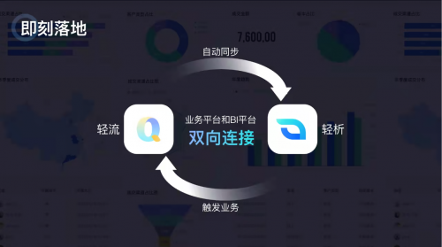 在今年7月6日輕流無代碼探索者大會上,輕流原生BI系統(tǒng)——“輕析”重磅發(fā)布。首先“輕析”和輕流可以高度協(xié)同,它提供了從應(yīng)用搭建到數(shù)據(jù)分析的全鏈路自定義功能,無需再進(jìn)行額外的開發(fā)工作,輕流的數(shù)據(jù)均可自動同步至“輕析”進(jìn)行數(shù)據(jù)分析工作,大大降低了企業(yè)引入BI工具的初期成本。通過“輕析”所產(chǎn)生的數(shù)據(jù)分析結(jié)果,觸發(fā)業(yè)務(wù)規(guī)則,從而影響輕流上的業(yè)務(wù)系統(tǒng)。