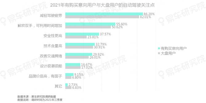 整體上,有自動(dòng)駕駛購(gòu)買(mǎi)意向的用戶(hù)與大盤(pán)用戶(hù),對(duì)自動(dòng)駕駛的關(guān)注與訴求比較接近,集中于減輕駕駛疲勞、增加可利用時(shí)間等;