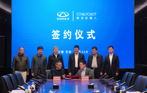 在蕪湖市委書記單向前,市領(lǐng)導(dǎo)張志宏、張東,以及奇瑞控股集團(tuán)有限公司董事長尹同躍,安徽酷哇機(jī)器人有限公司董事長何弢等領(lǐng)導(dǎo)的共同見證下,奇瑞新能源汽車股份有限公司副總經(jīng)理周定華、安徽酷哇機(jī)器人有限公司副總裁何賽分別代表雙方公司簽約。