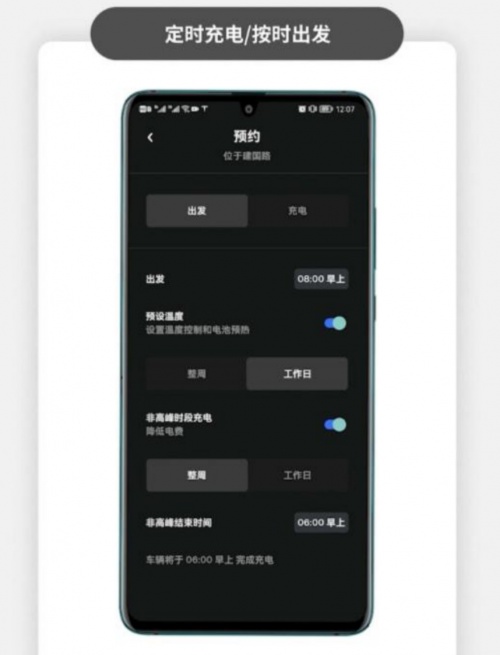 在開(kāi)啟定時(shí)充電后,在手機(jī)端充電界面還可以自行調(diào)節(jié)電流安培數(shù)。定時(shí)出發(fā)功能可以指定你的特斯拉在工作日或整周按照規(guī)則進(jìn)行充電,還可以開(kāi)啟非高峰時(shí)段充電,并設(shè)置結(jié)束時(shí)間,有助于利用峰谷電價(jià)降低成本。