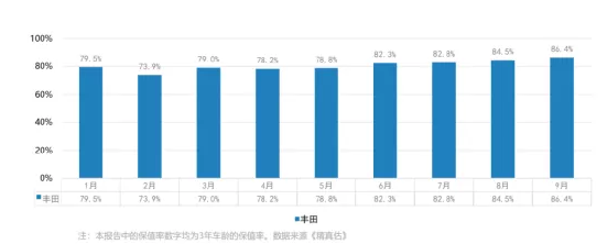 不僅如此,得益于TNGA架構(gòu)對產(chǎn)品的賦能,其二手車保持率也在同級中保持絕對領(lǐng)先水平。要知道在新車迭代速度越來越快的當(dāng)下,消費者更趨向于購買保值率高的產(chǎn)品,二手車保值率的高低已經(jīng)成為影響消費者購車決策的重要指標(biāo)。據(jù)數(shù)據(jù)顯示,2021年豐田品牌3年車輛的保值率一直呈上升趨勢,持續(xù)占據(jù)榜首位置,并遙遙領(lǐng)先行業(yè)平均值,以剛剛過去的9月份為例,豐田品牌3年車輛的保值率達(dá)到驚人的86.4%,環(huán)比8月提升了1.9%。此數(shù)據(jù)直觀展現(xiàn)了TNGA架構(gòu)為豐田產(chǎn)品所帶來的價值保證以及賦予的強大市場競爭力。