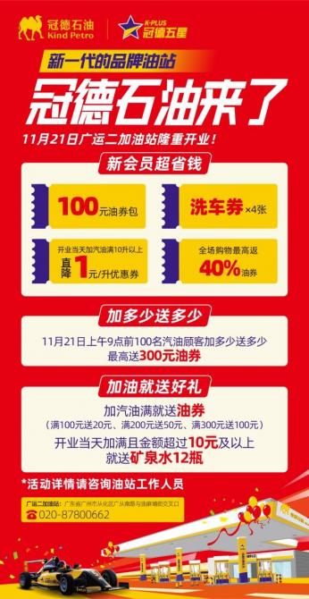 活動(dòng)期間,車主們只需按要求注冊(cè)新會(huì)員就可免費(fèi)得到100元油券包、4張免費(fèi)洗車券跟每升直降1元優(yōu)惠券,實(shí)打?qū)嵉母@徊⑶?,開業(yè)當(dāng)天前100位會(huì)員加多少送多少,最高送300元油券;此外,冠德石油還開展加油就送好禮活動(dòng),門檻超低,開業(yè)當(dāng)天加油只要滿10元就送12瓶礦泉水,加汽油滿一定金額就送油券,最高滿300元送100元油券,鉅惠之大,造就了一場車主們的加油狂歡。