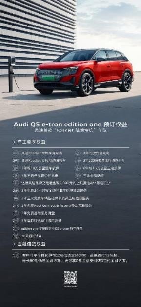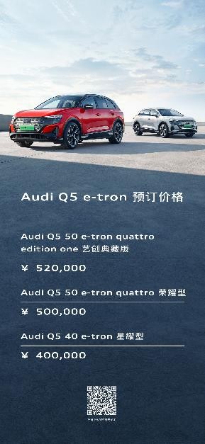 奧迪Q5 40 e-tron星耀型預(yù)訂價(jià)格為40萬(wàn)元,奧迪Q5 50 e-tron quattro榮耀型預(yù)訂價(jià)格為50萬(wàn)元,囊括“整車與三電質(zhì)保”、“黑金會(huì)員助理”、“30天超長(zhǎng)試駕”、“3年不限量免費(fèi)公樁充電”、“送裝奧迪充電墻盒”等12重尊享權(quán)益。特別打造的奧迪Q5 50 e-tron quattro藝創(chuàng)典藏版也同步亮相,預(yù)訂價(jià)格為52萬(wàn)元,以“edition one”標(biāo)識(shí)和限定配置,以及額外的專屬限定號(hào)數(shù)字藏品、藝術(shù)家共創(chuàng)數(shù)字藏品車型的同款貼紙、奧迪Roadjet專屬電動(dòng)滑板車、代客充電服務(wù),以及3年200張通兌卡券,賦予消費(fèi)者尊貴的專屬體驗(yàn)。同時(shí),上汽奧迪推行360°充電服務(wù),以全方位的生態(tài)體系,為用戶提供便捷無(wú)憂的充電服務(wù)解決方案。