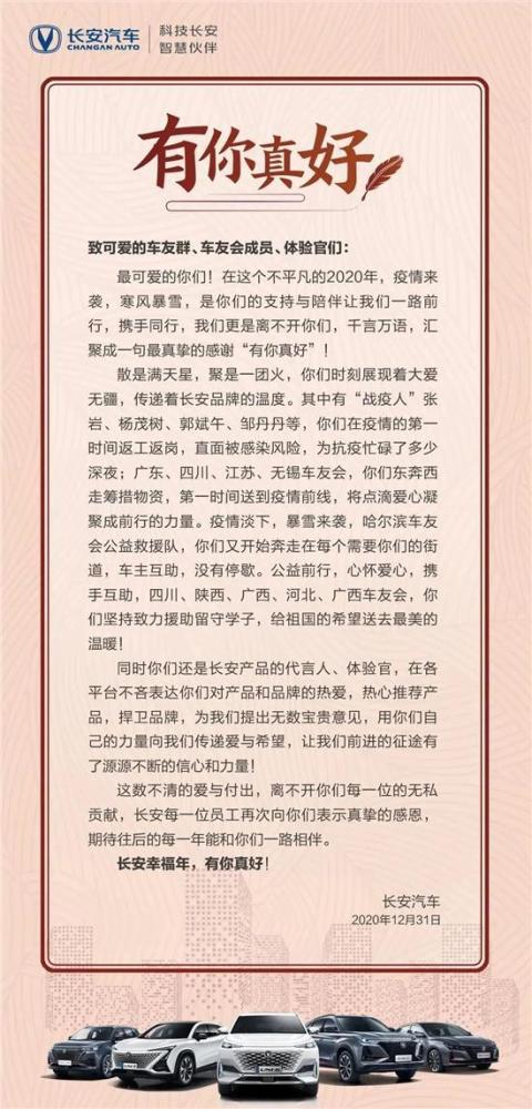 從1862年,長(zhǎng)安汽車集團(tuán)前身——上海洋炮局于上海松江創(chuàng)建,它是為中國(guó)近代工業(yè)先驅(qū),到2021年,長(zhǎng)安汽車逆勢(shì)突圍,書(shū)寫中國(guó)汽車自主品牌的神話,百年風(fēng)雨的長(zhǎng)安汽車,唯有一顆初心不變。在2020年年末,長(zhǎng)安汽車發(fā)表了《有你,真好》的新年寄語(yǔ),全文上下,無(wú)不透露出長(zhǎng)安的伙伴精神。