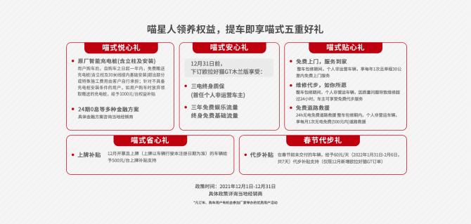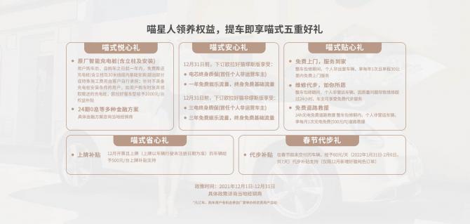 其中,最引人關(guān)注的是喵式省心禮和春節(jié)代步禮:12月開票且上牌的好貓和好貓GT木蘭版(上牌以車輛行駛本注冊日期為準),給予500元/臺的上牌補貼;在春節(jié)前未交付的車輛,給予60元/天的代步補貼支持(2022年1月31日——2月6日,僅限12月新增的好貓純色車型和歐拉好貓GT訂單)。