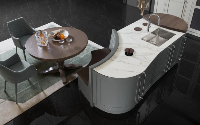 如果想給廚房空間增添更多溫度,不妨像《圖拉朵》一樣設(shè)計(jì)成轉(zhuǎn)角弧線門型。圓潤的設(shè)計(jì),摒棄了直角的冷冽感,讓古典的韻味更濃,而圓弧臺(tái)面及門板則打造多功能弧形島臺(tái),造型別致又精巧。
