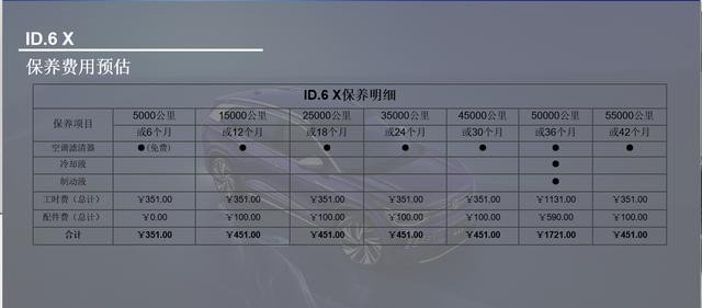 說(shuō)完了用電費(fèi)用和保險(xiǎn)費(fèi)用,那接下來(lái)就是保養(yǎng)費(fèi)用了,對(duì)于大部分消費(fèi)者來(lái)說(shuō),質(zhì)保期內(nèi)肯定是在4S店來(lái)保養(yǎng)的,過(guò)了質(zhì)保期有些朋友會(huì)選擇在其他第三方機(jī)構(gòu)來(lái)保養(yǎng),作為一臺(tái)純電動(dòng)車型,保養(yǎng)相比于燃油車又有優(yōu)勢(shì)了,根據(jù)ID.6X的保養(yǎng)手冊(cè),車輛首保為五千公里,首保時(shí)候更換空調(diào)濾芯免費(fèi),檢查三電系統(tǒng)只需要付一下工時(shí)費(fèi)就可,另外以后每一萬(wàn)公里進(jìn)行一次保養(yǎng)。ID.6X常規(guī)保養(yǎng)非常簡(jiǎn)單,需要更換的也只是空調(diào)濾芯了(每一萬(wàn)公里更換),兩年或者5萬(wàn)公里時(shí)更換剎車油和冷卻液,此外就是工時(shí)費(fèi)了。綜合來(lái)看,三年60000公里總的保養(yǎng)費(fèi)用為4327元,每年的保養(yǎng)花費(fèi)是1442元,還是很省的。