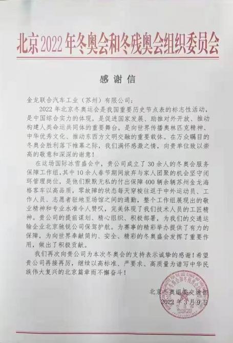 北京冬奧組委感謝信中勉勵(lì)蘇州金龍:“再接再厲,繼續(xù)以高標(biāo)準(zhǔn)、嚴(yán)要求、高質(zhì)量,為譜寫(xiě)中華民族偉大復(fù)興的北京篇章而不懈奮斗!”