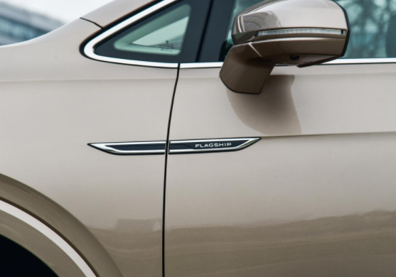 側(cè)面前翼子板與車門相接處擁有“FLAGSHIP”的裝飾牌及代表為全系頂配的旗艦版車型。