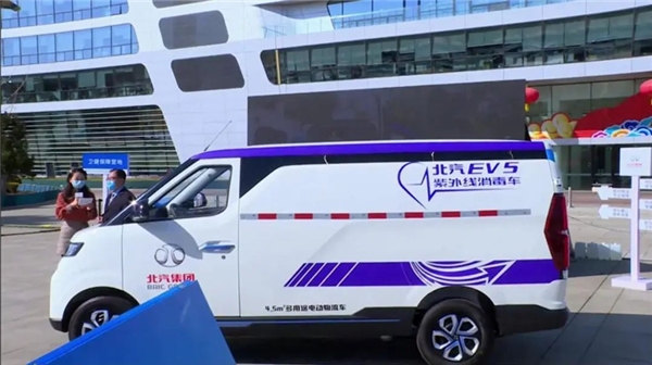 北汽EV5紫外線消毒物流車通過加裝車載醫(yī)用級紫外線消毒燈,可向外輻射波長為253.7nm的紫外線,以殺菌能力最強的紫外線波段來消殺多種病菌,為城市物流貨物提供一個安全、無污染的運輸空間。