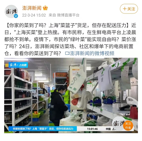 當前,復(fù)雜而嚴峻的疫情態(tài)勢,不僅是對上海防疫體系的考驗,也對上海本地物資供應(yīng)造成了一定的壓力。
