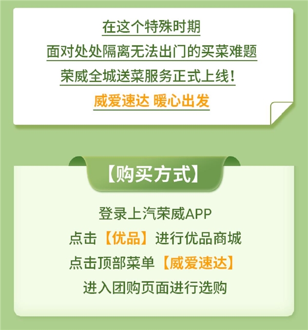 為了解決廣大上海市民的燃眉之急,上汽榮威“聯(lián)手”上汽安悅,在上汽榮威APP上全新開通了“威愛速達”全城送菜團購服務(wù),市民可通過手機自帶的各大應(yīng)用商店自行下載、安裝上汽榮威APP,在注冊、登錄成功之后,點擊上汽榮威APP屏幕右下方的“優(yōu)品”選項,進入到優(yōu)品商城,再點擊頂部菜單“威愛速達”,即可在線上團購蔬菜、水果、蛋奶以及米面糧油等食品。