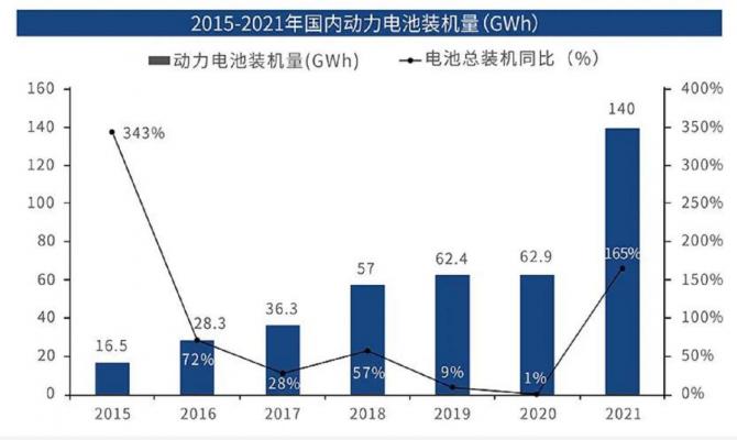 在綠色環(huán)保的國家政策推動下,近年來國內(nèi)新能源電動汽車迅猛發(fā)展,交付數(shù)量逐年遞增。根據(jù)GGII統(tǒng)計(jì),作為電動汽車的核心部件動力電池2015-2021量呈現(xiàn)逐年上升的趨勢,尤其在過去的2021年總裝機(jī)量達(dá)到了140GWh,相比2020同比增長165%,發(fā)展態(tài)勢迅猛。
