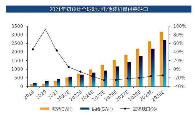 根據(jù)SNE research在2021年初發(fā)布的電動汽車研究報(bào)告數(shù)據(jù)顯示,如果以2021年年初的規(guī)劃產(chǎn)能進(jìn)行測算,動力電池的銷售產(chǎn)出缺口將在2022年出現(xiàn),動力電池的裝機(jī)a缺口會在2023年出現(xiàn)。到2025年動力電池銷售產(chǎn)出缺口將達(dá)到37%,裝機(jī)缺口會達(dá)到25%且持續(xù)維持緊張的狀態(tài)。2021年初動力電池明顯緊張的供需狀態(tài),促使全球鋰電廠商開啟新一輪擴(kuò)產(chǎn)周期。
