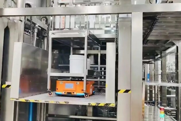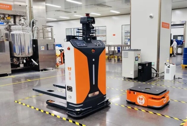 同時(shí),由Gulf-1400-CDD無(wú)人叉車(chē)機(jī)器人負(fù)責(zé)原材料從原料倉(cāng)到乳化車(chē)間的搬運(yùn)、空桶的產(chǎn)線返回、半成品從產(chǎn)線到車(chē)間的中轉(zhuǎn)、包材的產(chǎn)線搬運(yùn),搭配FMS調(diào)度管理系統(tǒng),實(shí)現(xiàn)最優(yōu)任務(wù)分配方案,讓倉(cāng)儲(chǔ)物流整體效能最大化。