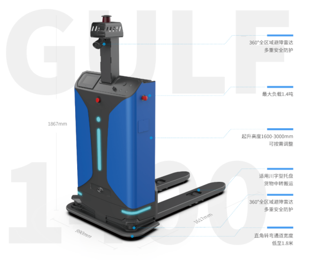 Gulf-1400-CDD無(wú)人叉車(chē)采用斯坦德自研激光SLAM導(dǎo)航技術(shù),無(wú)需固定基礎(chǔ)設(shè)施改造即可完成部署運(yùn)行,同時(shí)通過(guò)托盤(pán)到位檢測(cè)傳感器、貨叉防撞傳感器、3D視覺(jué)相機(jī)、RFID等多傳感器融合技術(shù),實(shí)現(xiàn)智能高效安全取放料作業(yè)。