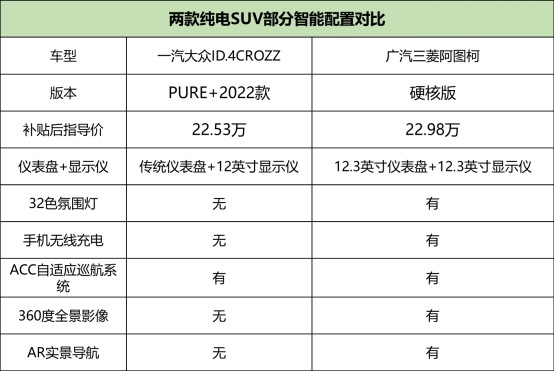 很多純電車型都會通過智能配置的搭載,讓消費者的駕乘品質(zhì)得到提升。為了公平對比,本次選取了同是補貼后售價在22萬左右的車型版本:一汽大眾ID.4 CROZZ PURE+2022款(補貼后官方售價22.53萬)和廣汽三菱阿圖柯硬核版(補貼后官方售價22.98萬)。兩者在智能配置方面,都表現(xiàn)出都市純電SUV的主流水準。但細致對比下來,售價僅高出4500元的阿圖柯硬核版,在科技智能配備上卻比ID.4 CROZZ PURE+2022款豐富不少。