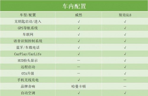 而在車內(nèi)配置方面,兩臺(tái)車均配備了真皮材質(zhì)的多功能方向盤、無(wú)鑰匙啟動(dòng)/進(jìn)入、GPS導(dǎo)航系統(tǒng)、車聯(lián)網(wǎng)、語(yǔ)音識(shí)別控制系統(tǒng)、藍(lán)牙/車載電話、CarPlay、CarLife、自動(dòng)空調(diào)等功能。不過(guò)威然多出了手機(jī)無(wú)線充電、12個(gè)揚(yáng)聲器的哈曼卡頓音響、30色氛圍燈等功能,舒適性配置更多。GL8則配備了HUD抬頭顯示、遠(yuǎn)程啟動(dòng)、OTA升級(jí)等,對(duì)比起來(lái)也是不相上下。